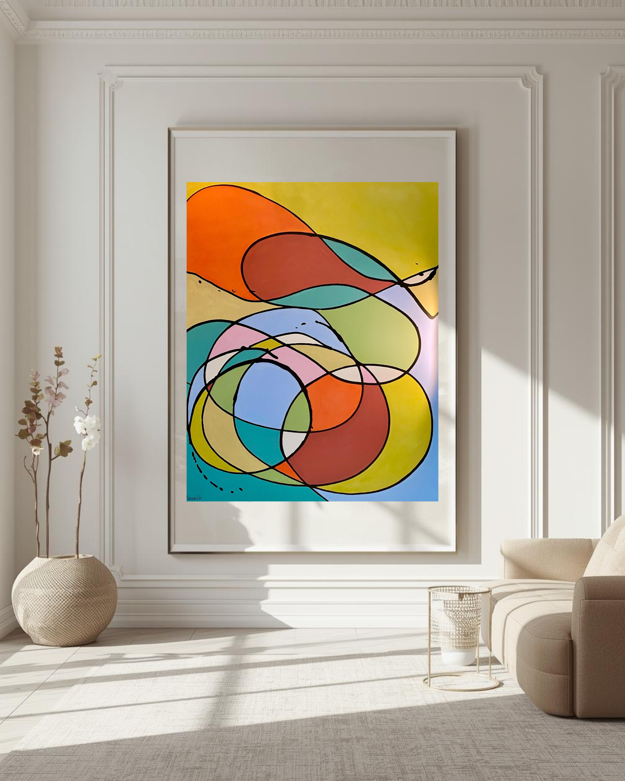 The recurring circular and looping elements within this abstract design suggest continuity and flow.